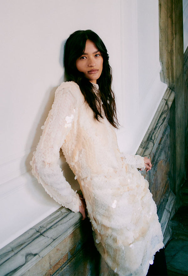 A muted palette of deep neutrals, metallic reflections, and bold black captures the quiet intensity of the night, where mystery and individuality take center stage. Glossy satin meets textured wool, shimmering sequins contrast with matte cotton, and soft fabrics blend seamlessly.